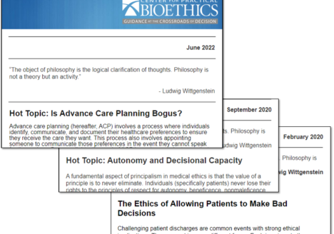 Affiliate Organizations of our Center Ethics Services receive our Ethics Dispatch as part of their annual membership. The Dispatch is designed to contribute educational content for ethics-committee-meeting agendas by discussing bioethical issues, related news headlines, case studies, and philosophical musings from Center staff and other contributing authors.